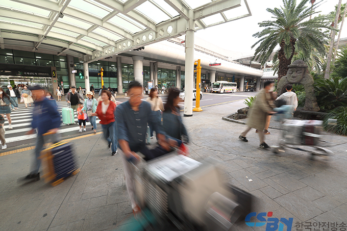 제주공항 1층 도착장은 긴 연휴를 제주에서 보내려는 관광객부터, 일찌감치 고향에 내려온 귀성객들이 저마다 들뜬 표정으로 들어오고 있었다.