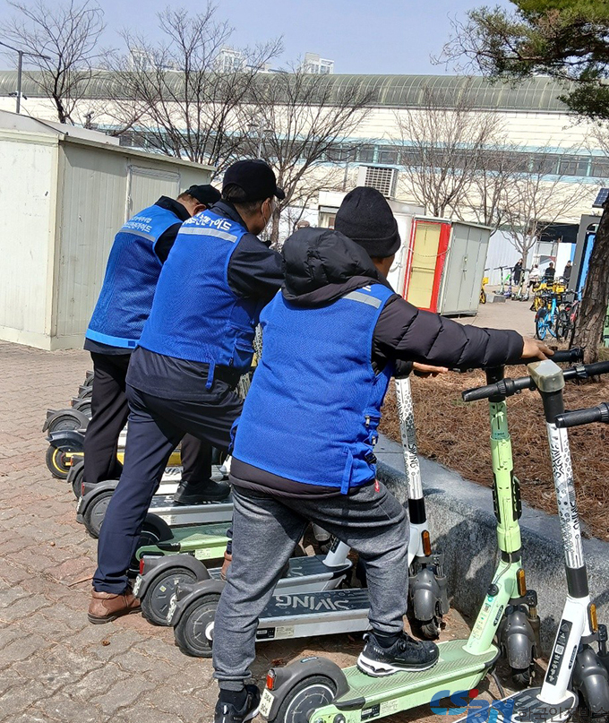 전동킥보드 안전 가이드 사업은 지난 2024년부터 노인일자리 사업과 연계해 시행됐다. 어르신들이 주요 상가 밀집 지역과 전철역 인근에서 무단 방치된 전동킥보드와 공유자전거를 정리ㆍ재배치해 보행환경을 개선하는 사업이다.
