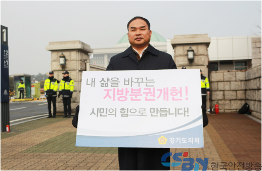 (한국안전방송) 경기도의회 박창순 의원(더불어민주장, 성남3)이 23일(금) 국회 정문 앞에서 지방분권 개헌을 촉구하는 1인 시위를 벌였다.