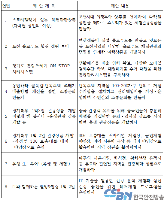 8개 제안은 ▲스토리텔링이 있는 체험관광상품(다락원 상인의 여정), ▲포천 슬로푸드 힐링 캠핑 투어, ▲경기도 통합 생활쓰레기 ON-STOP 처리시스템, ▲응답하라 골목길! 단독주택 쓰레기 배출방법 개선을 통한 소통문화 만들기, ▲홍색관광상품 개발, ▲의정부 306보충대를 테마야영장으로 운영, ▲ 유생 생(生) 체험, ▲IT와 함께하는 웰빙&힐링 1박 2일 등이다.