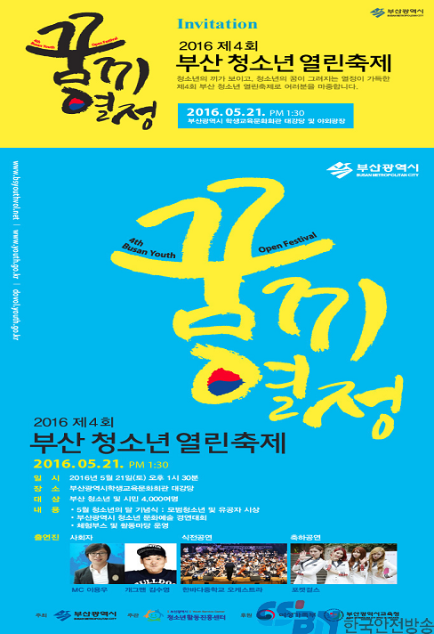 (한국안전방송) 부산시는 5월 청소년의 달을 맞이하여 청소년의 자아발전 계기 마련을 위해 청소년 및 가족, 청소년지도자 등 4,000여 명이 참가한 가운데 오는 21일 오후 1시 30분부터 오후 5시까지 부산학생교육문화회관(부산어린이대공원 내) 대강당 및 야외광장에서 ‘제4회 청소년 열린 축제’를 개최한다고 밝혔다.