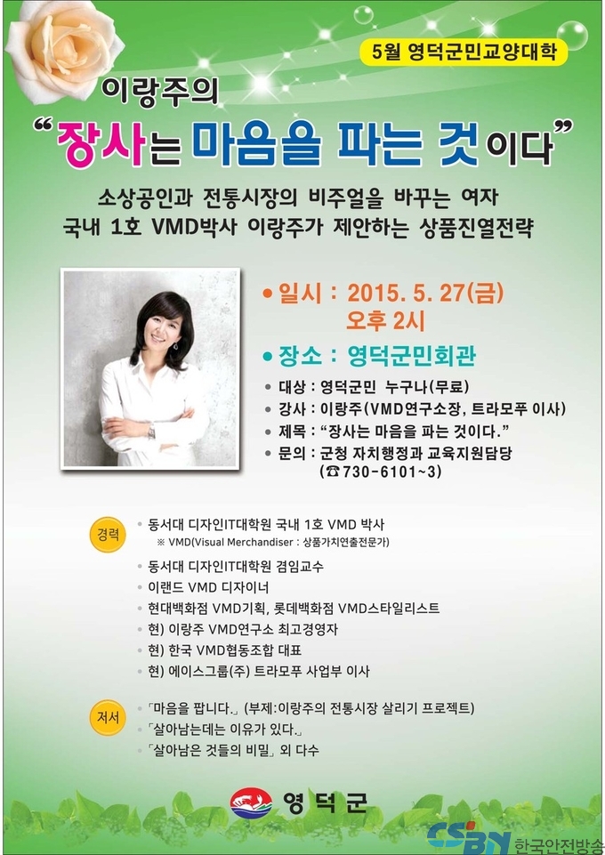 (한국안전방송) 영덕군은 오는 27일(금) 오후 2시 영덕군민회관에서 한국 VMD협동조합 이사장인 이랑주 박사의 ‘장사는 마음을 파는 것이다’라는 주제로 소상공인, 위생업소 종사자, 군민 등을 대상으로 5월 영덕군민교양대학을 개최한다고 밝혔다.
