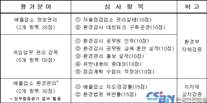 평가는 특.광역시, 광역도, 기초자치단체 등 3그룹으로 나눠 사업장 점검실적, 환경감시 인력, 교육·홍보 실적 등 사업장 관리기반 3개 분야 9개 항목을 평가했다.