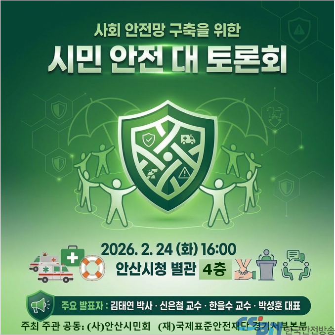 (사)안산시민회 (회장 이병걸)와 (재)국제표준안전재단 경기서부본부(본부장 김태연)에서, 2월24일(화)16시 안산시청 별관 대회의실 4층에서 '사회안전망 구축을 위한 시민 안전 대토론회'가 열린다.